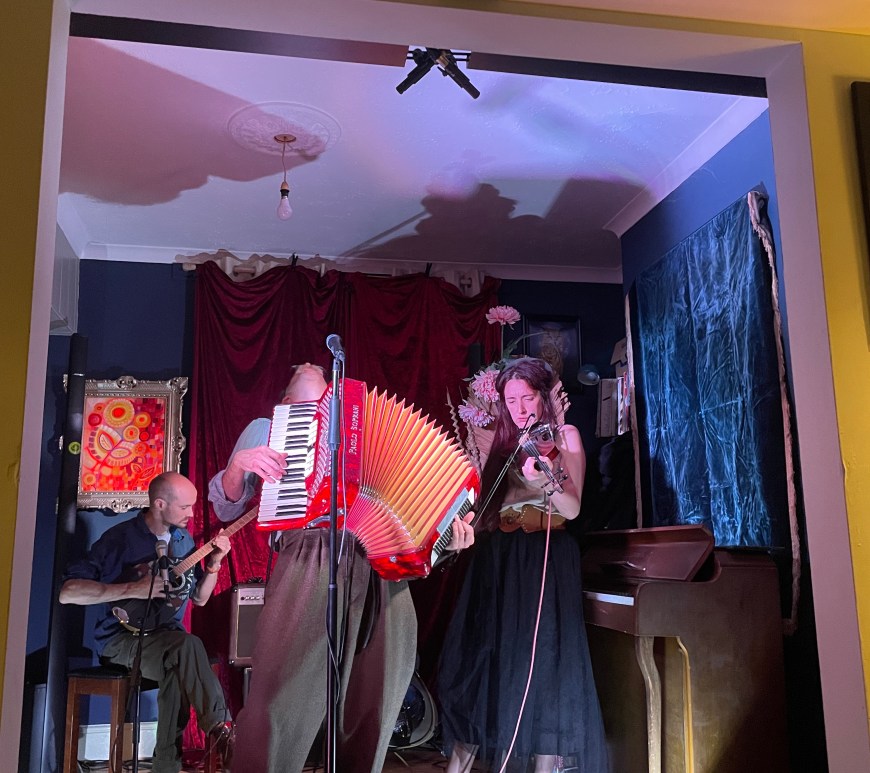 Here for all to enjoy, Julian on guitar, vocal and accordion, along with violin player Cally Gibson, filmed in a mizzley Falmouth backyard on Sunday October 1st 2023. Aman Cheung and his crew of travelling documentary makers had turned up to a Philanthropist gig at The Front (Falmouth, Cornwall) the previous evening and agreed to film them the next morning, here is what they managed … Continue reading Tiny Backyard Concert