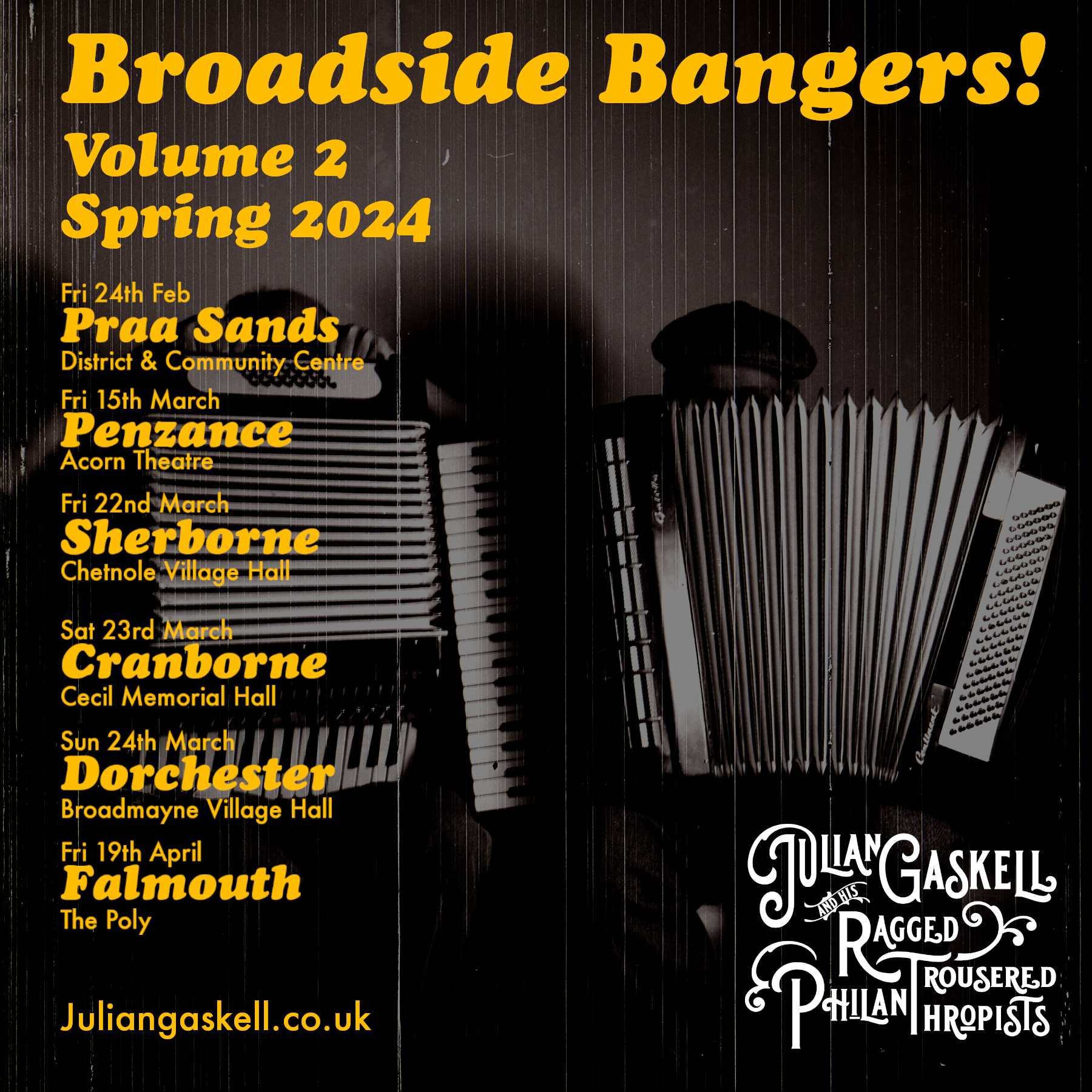 Revamped and refined since the 2023 vintage, Broadside Bangers Volume 2 presents a journey into the archives with the most melodramatic, gruesome and supernatural ballads from the 16th to 19th centuries. We will perform these old lyrics concerning funeral arrangements, cat food, poverty, dishonesty, water quality, marriage and more in a riotous, folk- punk, theatrical plethora of musical styles.