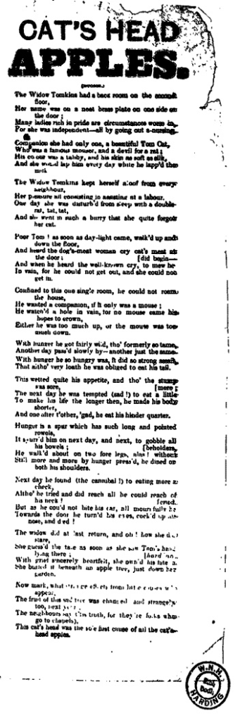 The lyrics to ‘Cat’s Head Apples’ were found by Julian Gaskell on a late 19th century broadside print in the Bodleian Library, using an academically rigorous search for ‘cats’: Roud: V6660 Bod:11705 NOTE – this link no longer works, Bodleian Library don’t do ballads anymore, sorry!