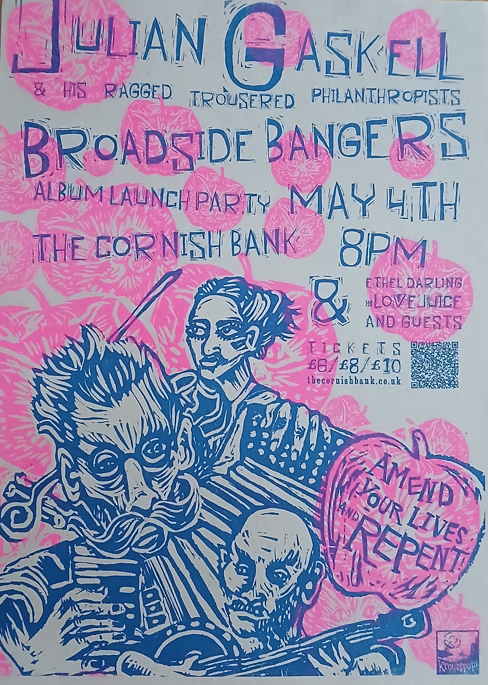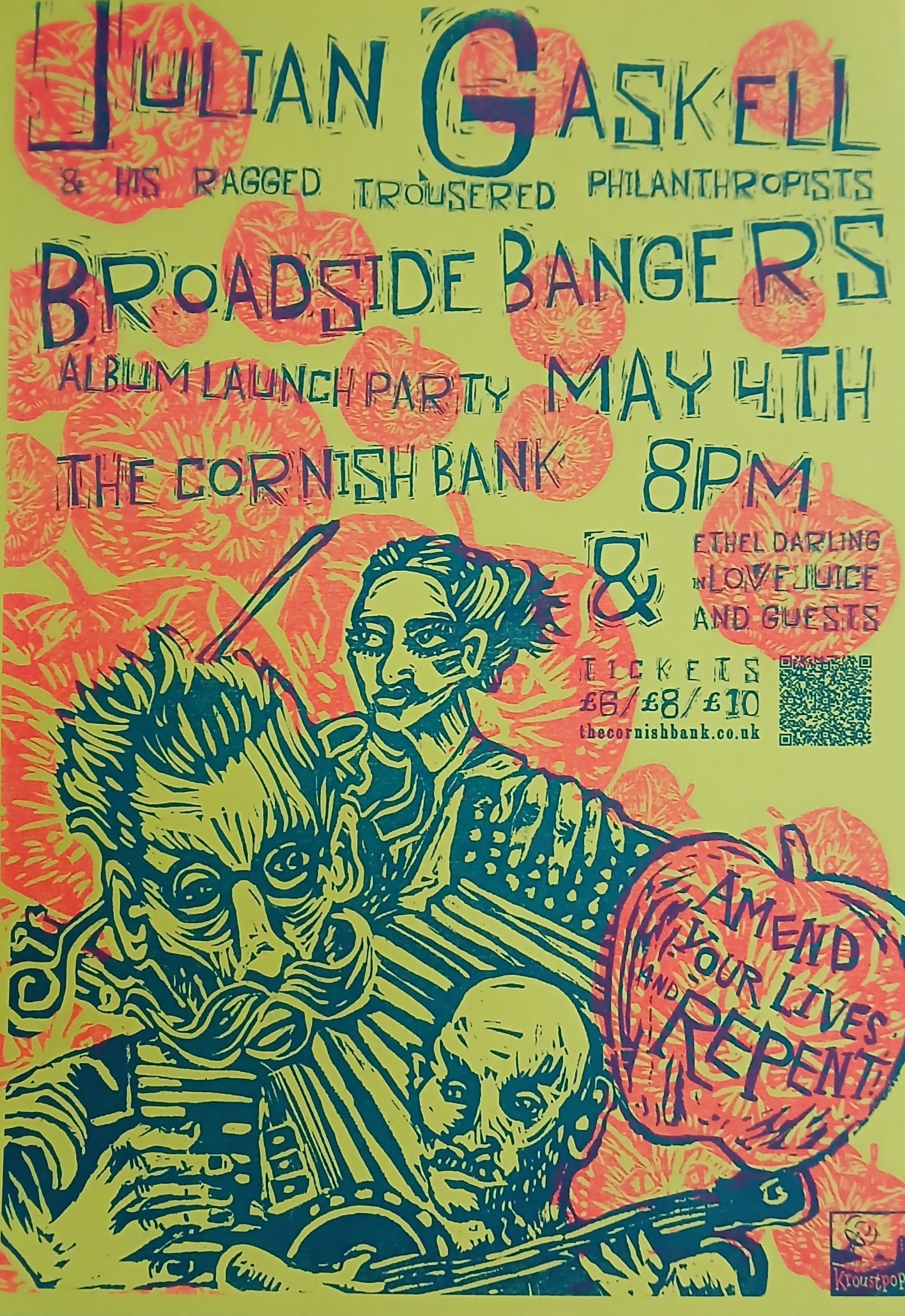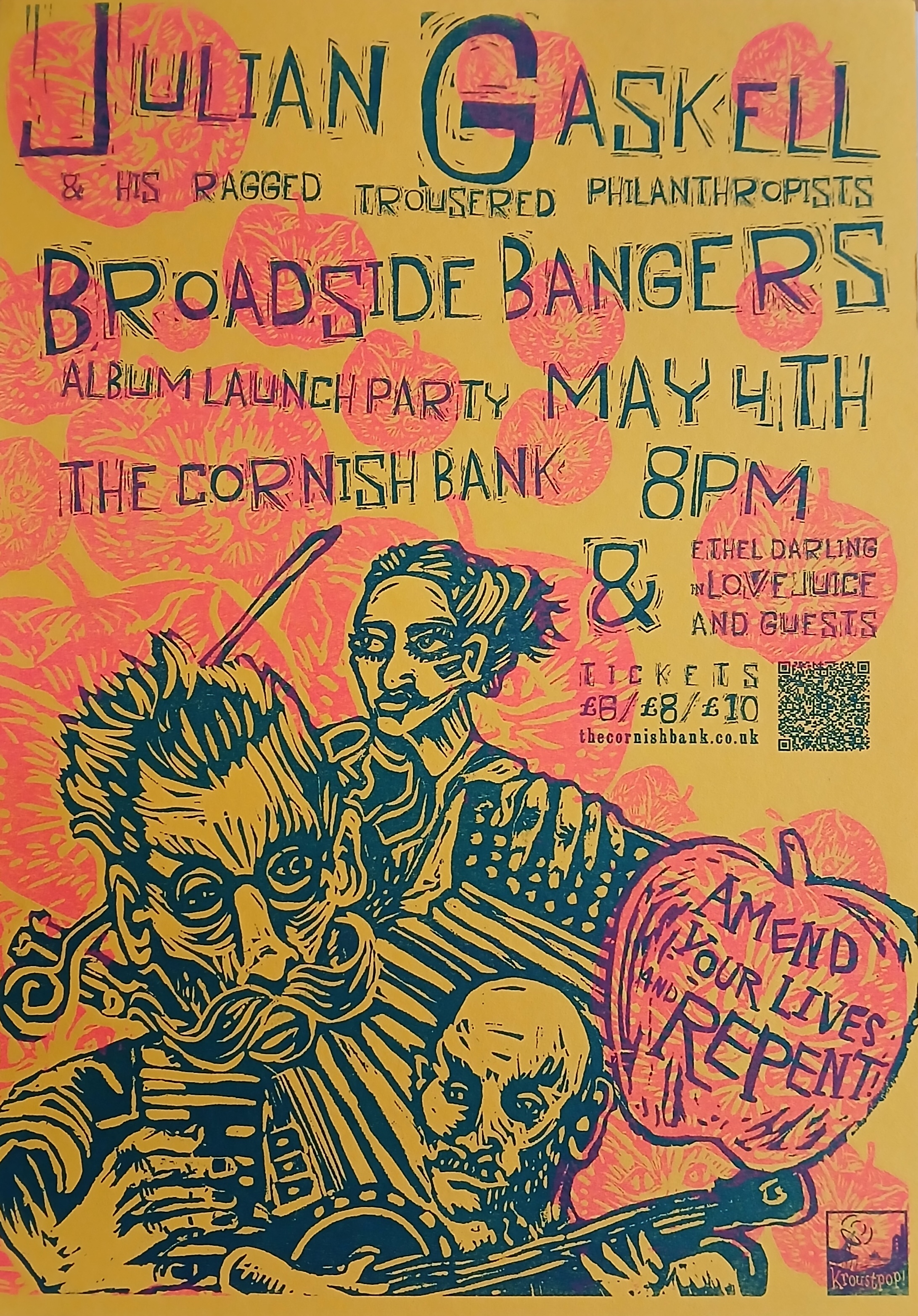 Julian Gaskell & his Ragged Trousered Philanthropists will be returning to the Cornish Bank on Sunday May 4th for a concert to celebrate the long-awaited release of our album Broadside Bangers on Kroustpop! Records.